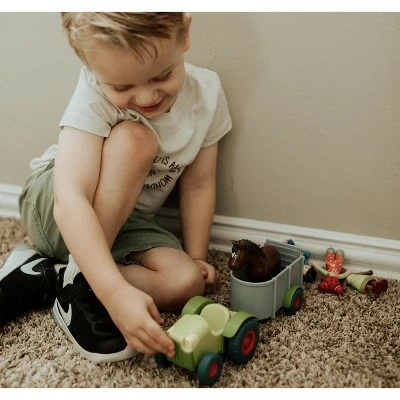 This sturdy green tractor/trailer combo is just what the Little Friends need to get to work! Whether they need to haul a horse, some hay or fresh picked veggies from the field, this truck is perfect! Featuring wheels that roll, and a trailer that is removable with functioning ramp that opens and closes. Collect all the Little Friends doll characters, animals and accessories. Compatible with all HABA Little Friends items.