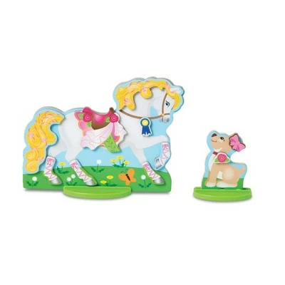 - Wooden magnetic show horse and dog play figures to dress in coordinating mix-and-match outfits