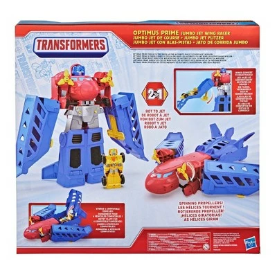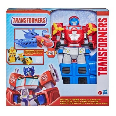 β’Includes: Optimus Prime Jumbo Jet Wing Racer playset, Bumblebee figure, and instructions.